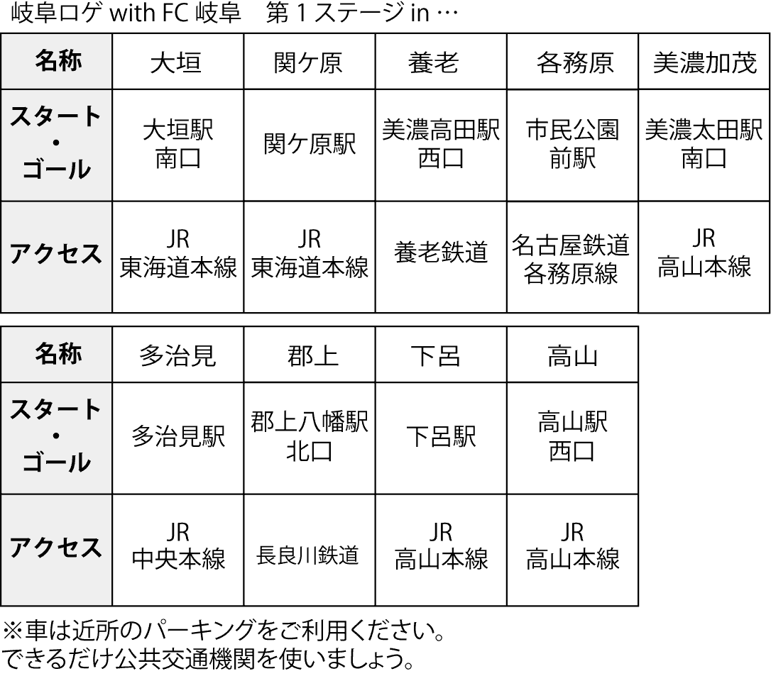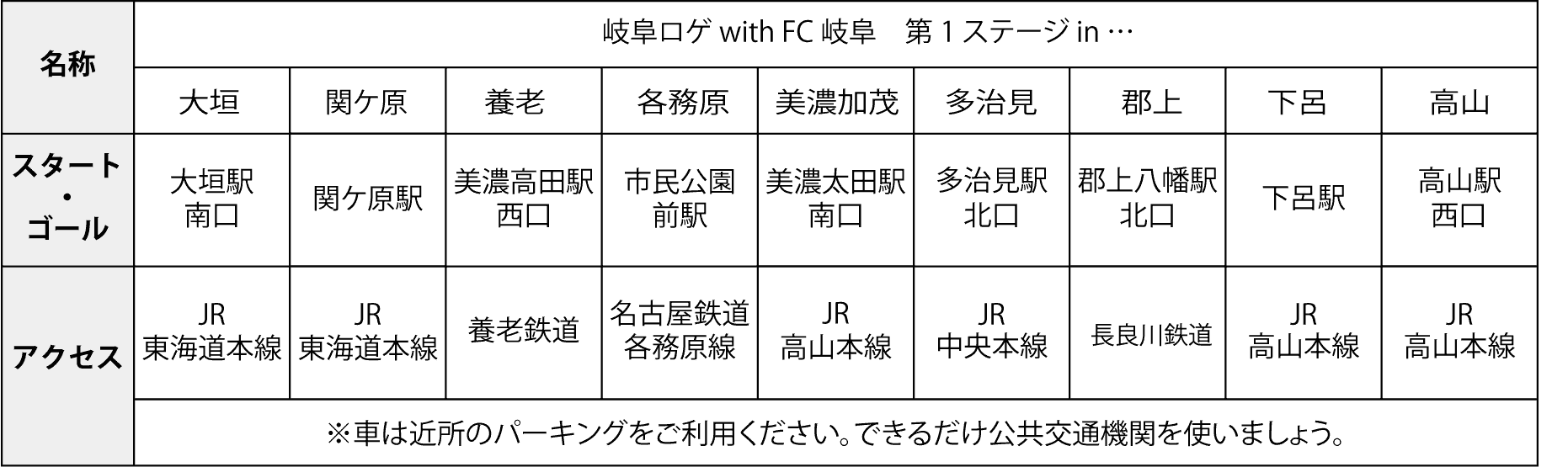 | 表彰 | 「第1ステージ+第2ステージ総合得点」にて、各部門ごとに「優勝、2位、3位」を表彰します (賞品あり) ランキングはこちら! ※「第1ステージのみの得点」は、8月31日、9月30日、10月20日をそれぞれの月の〆切日とし、各月ごとに地域別/部門別のランキング発表を行います(アプリ及びHPにて) ※ランキング発表は、リアルタイムで行います ※表彰時の「総合得点」の考え方 例)第1ステージに参加のチームA: 「in高山での最高 1050点」 「in郡上での最高 800点」 「in大垣での最高 1000点」 ⇒この場合、「第1ステージ最高得点の1050点+第2ステージの得点」がチームAの総合得点となります。 ※表彰式は、ゴールの岐阜メモリアルセンター 長良川競技場 芝生広場で行います ※第2ステージの詳細はこちら |